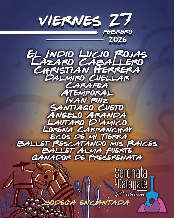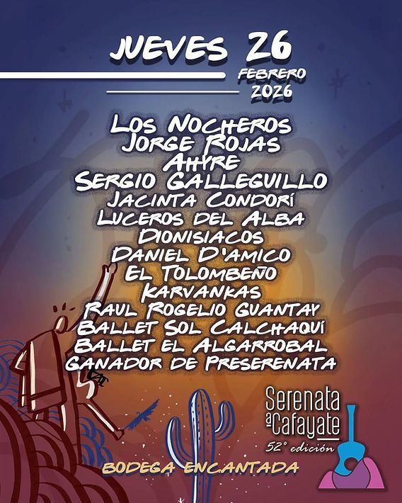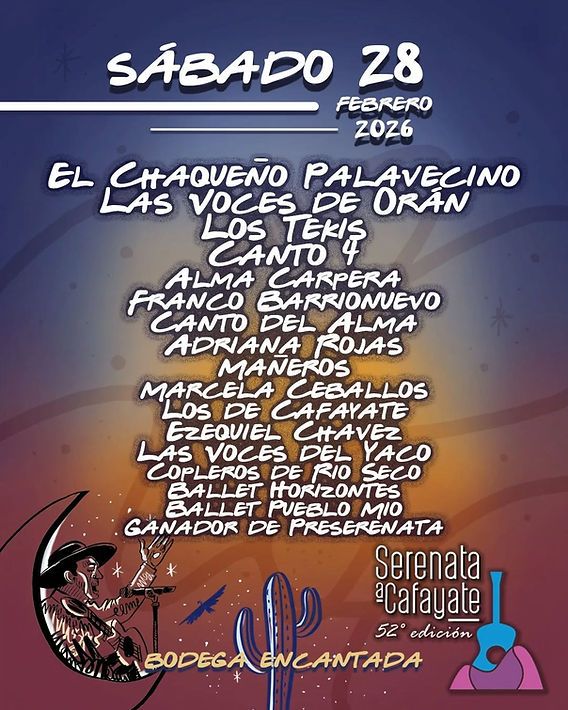 La Serenata a Cafayate ya palpita una nueva edición. El tradicional festival salteño presentó oficialmente la grilla artística de su 52º edición, que se realizará los días 26, 27 y 28 de febrero, en el predio de la Bodega Encantada, corazón cultural del Valle Calchaquí.
